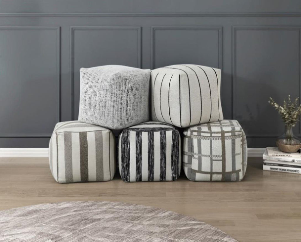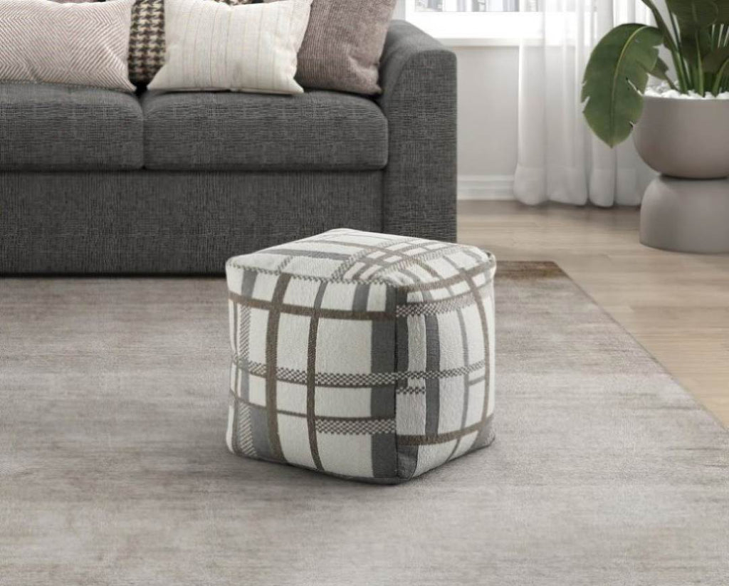 Whether the Monica Collection serves to provide stylish accent to your home’s décor, convenient seating when the need arises, or as perfect place to put up your feet, the square accent pouf’s versatility of purpose makes it a convenient addition to your space. The pouf is covered in geometric patterned multi-hued gray, brown, and beige jacquard fabric upholstery.