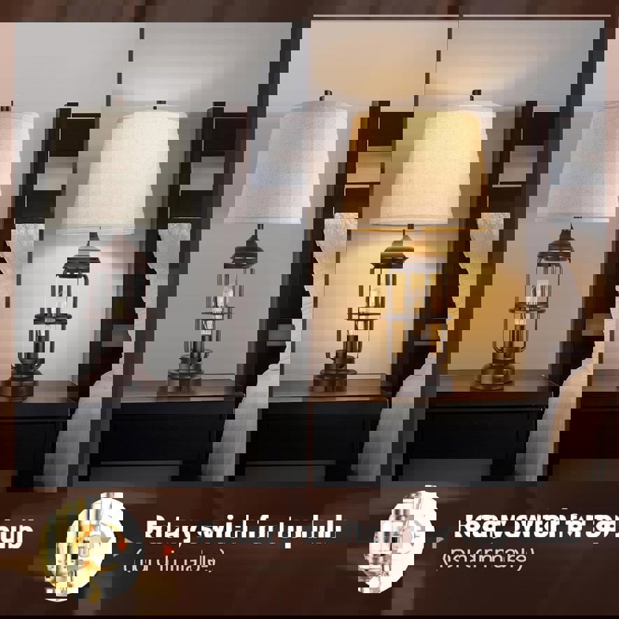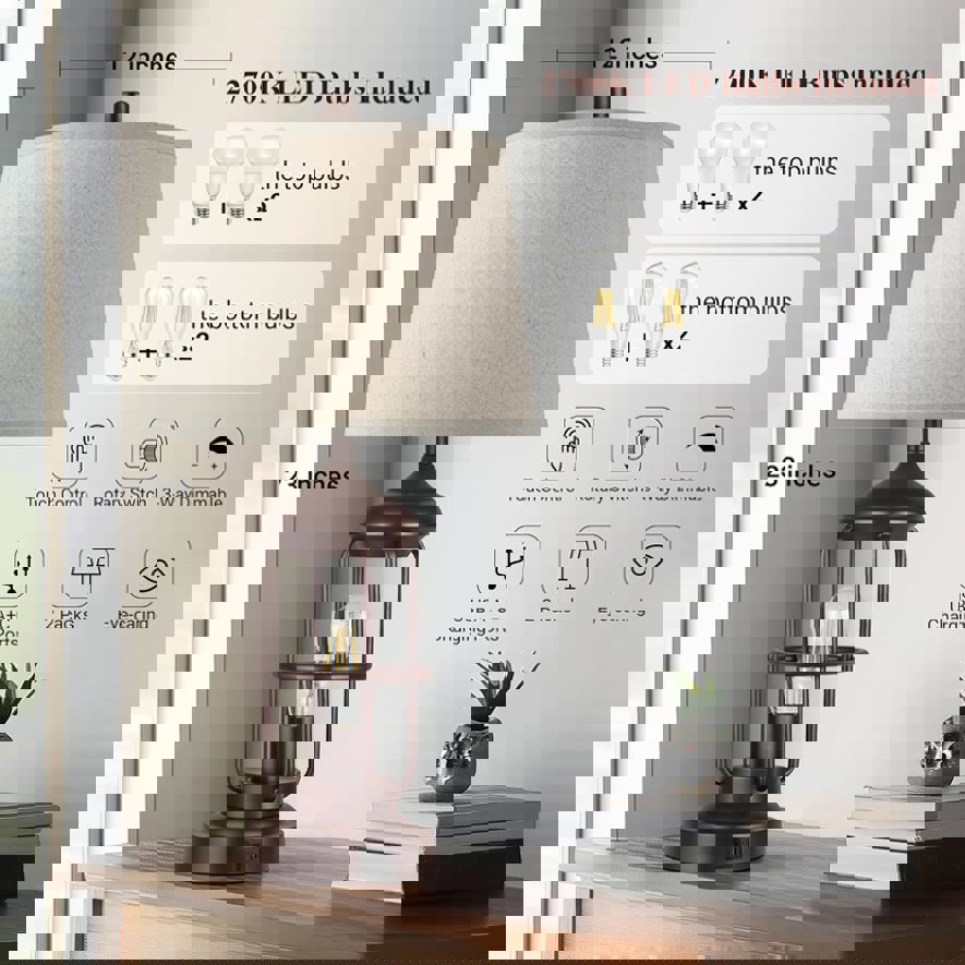 Warm light LED bulbs for eye-caring 4 super energy-saving 2700K LED bulbs—— 2 A19 bulbs for the top light and 2 ST58 bulbs for the bottom ones, which greatly saves you electricity bills. No flicker, no dizziness, match with the elegant fabric lamp shade makes the glow softer to protect your eyes efficiently. It is suitable for reading, using your laptop and phone under the lamps for bedroom set of 2, and reduce the damage of glow of the electronic products to the eyes.