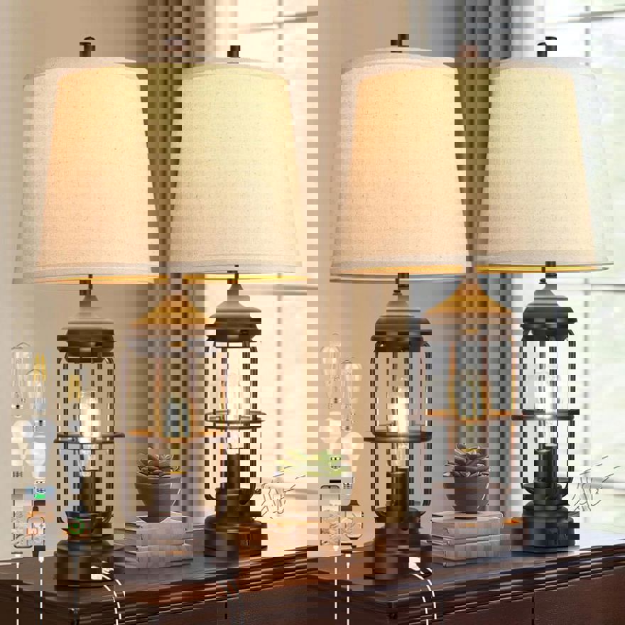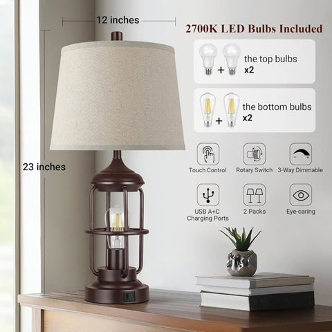: The lamps for bedrooms set of 2 with 2 nightlights provide you with more lighting choices. The fabric lampshade of table lamps for bedroom set of 2 is matched with the brown industrial-style metal lamp stand, with 2700K warm light, creating a unique farmhouse lamp that boasts both industrial and retro style. The metal column on the lampstand and the layered design make the glow of the night light unobstructed to add an antique retro atmosphere to your home.