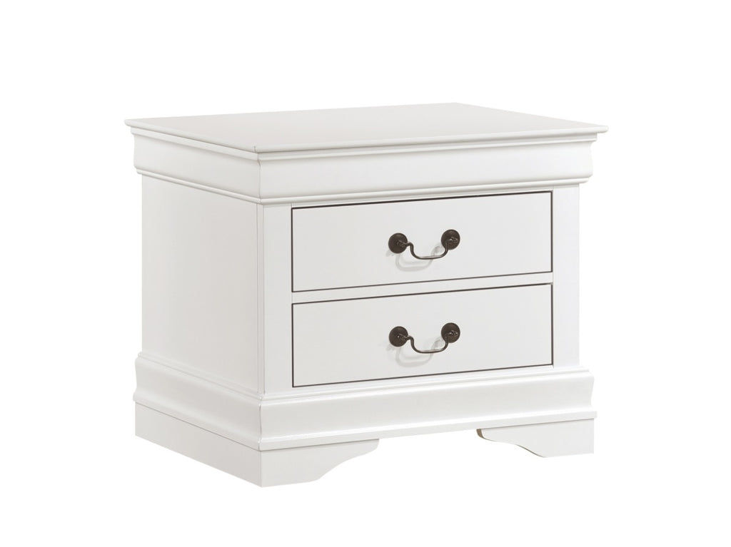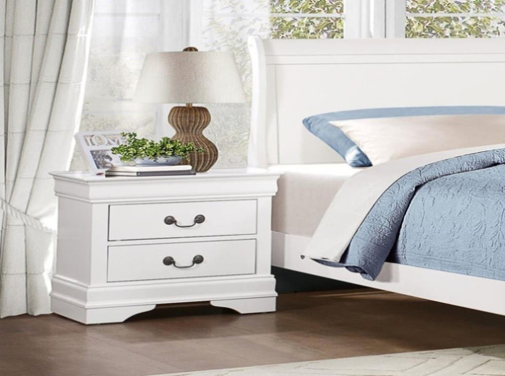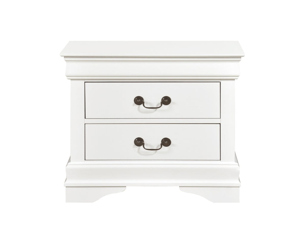 Traditional in design and modest in scale, the elegant Collection takes its design inspiration from the classic Louis Philippe styling. The Okume veneer of the nightstand is paired with a white finish and is accentuated by antique brass tone drop handles.