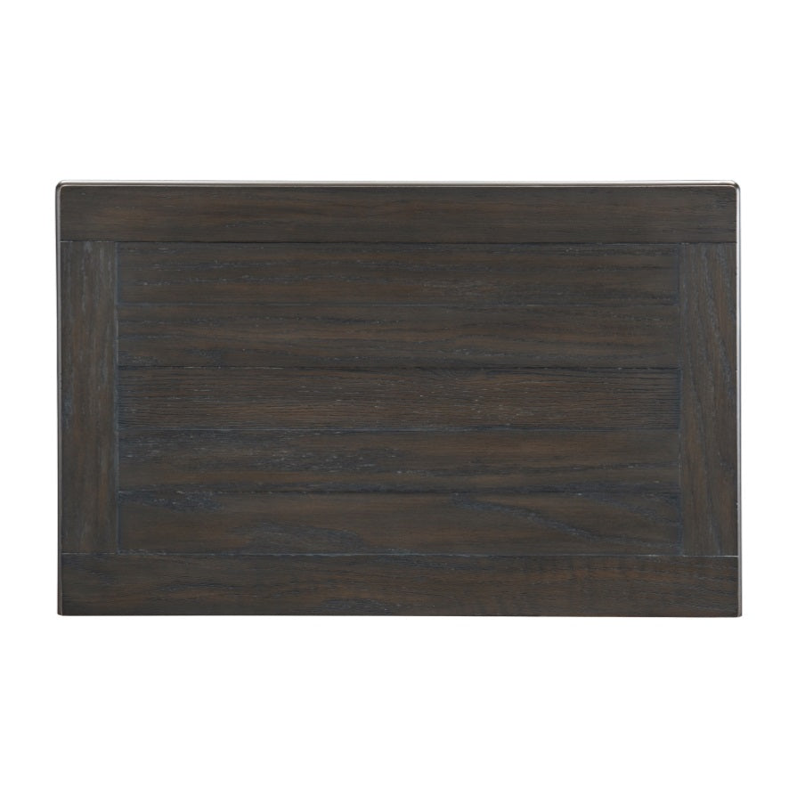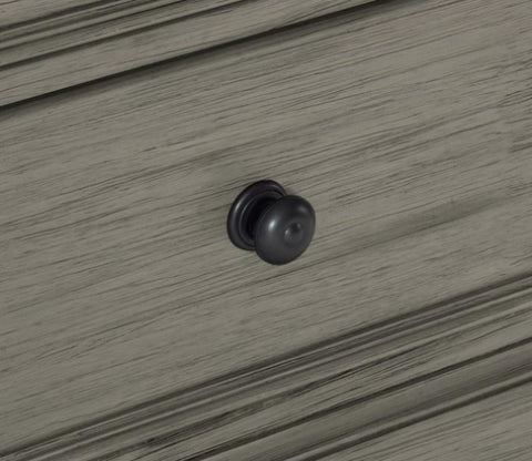 Transitional-rustic styling is expertly achieved in the design of the Weaver Collection. Antique gray provides bold contrast to the coffee-hued plank-style top of the nightstand, with pine solids and oak veneer further lending visual texture. Classic framing paired with dark metal knob hardware complete the rustic look.