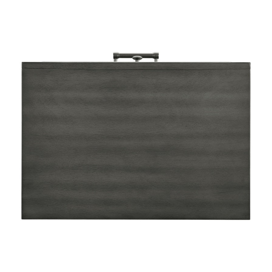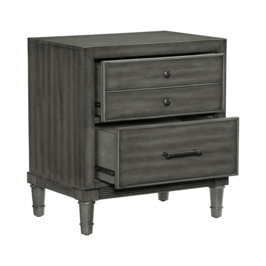 Modern convenience is paired with transitional style to create the versatile look of the Wittenberry Collection. The nightstands gray finish over okume veneer is complemented by the dark bronze finished knob and bar hardware that fronts the framed drawers of the piece.