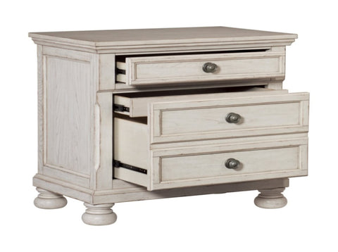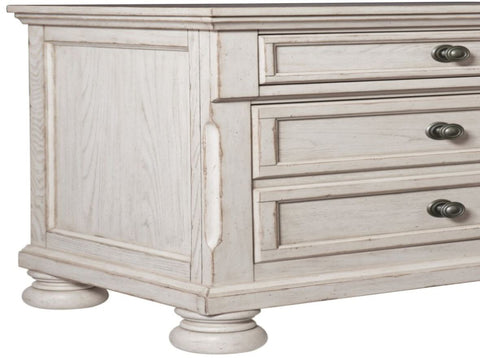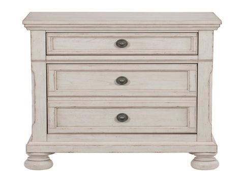 Traditional accents, such as turned bun feet support the nightstand, and an antique white, lightly wire-brushed finish on ash veneer and selected hardwoods, blends with framing and lines that complement your personal style. Hidden drawer storage in the nightstand is a clever way to hide your valuables.