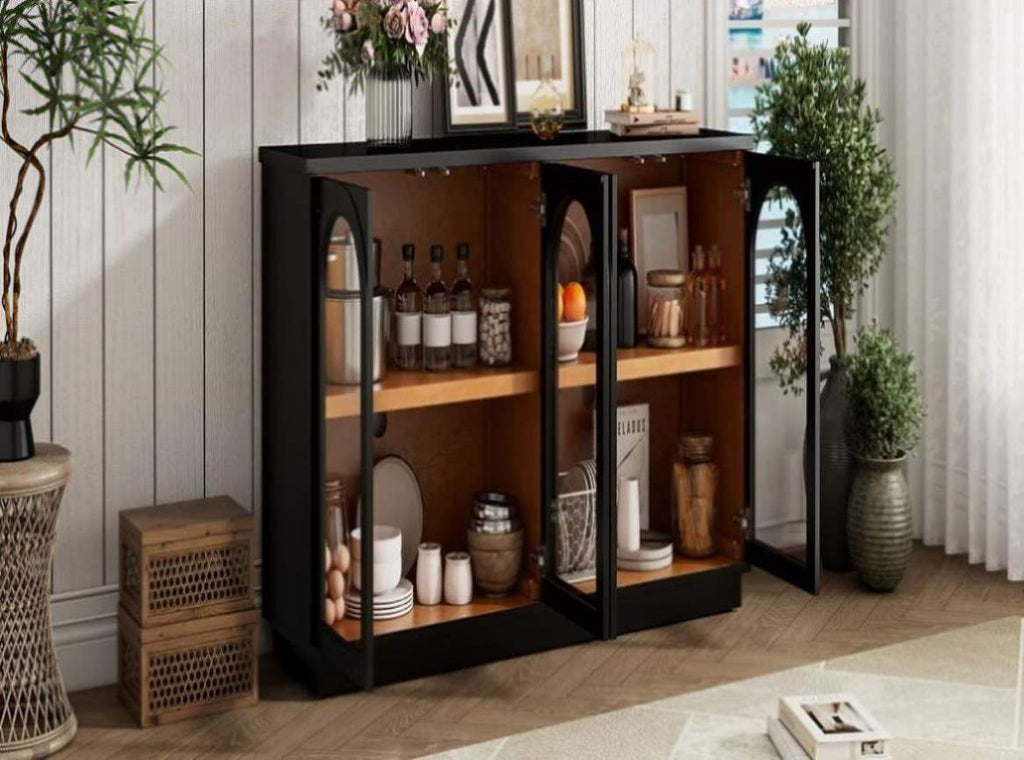 Elegant Design: This stylish buffet cabinet features arched glass doors and a smooth surface that is sleek and easy to clean, adding a touch of sophistication to any room.