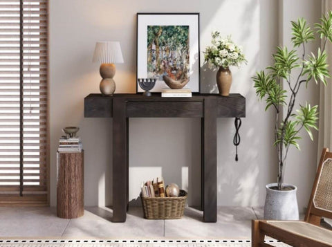 TREXM Rustic Minimalist Console Table with Hidden Drawer, Side Power Outlet,Wood Entryway Table for N715P361518P