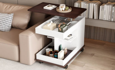 Designed with meticulous attention to detail, this end table combines versatility, style, and convenience in one. The beautiful wood grain finish combined with the modern, minimalist white accents create a visually stunning piece that will complement a variety of home decor styles. Its functional design allows it to serve multiple purposes, such as a sofa side table, a small leisure desk, or even a snack cart. The table features a top surface that can be easily adjusted both in height and orientation, offering a wide range of use cases and convenience.