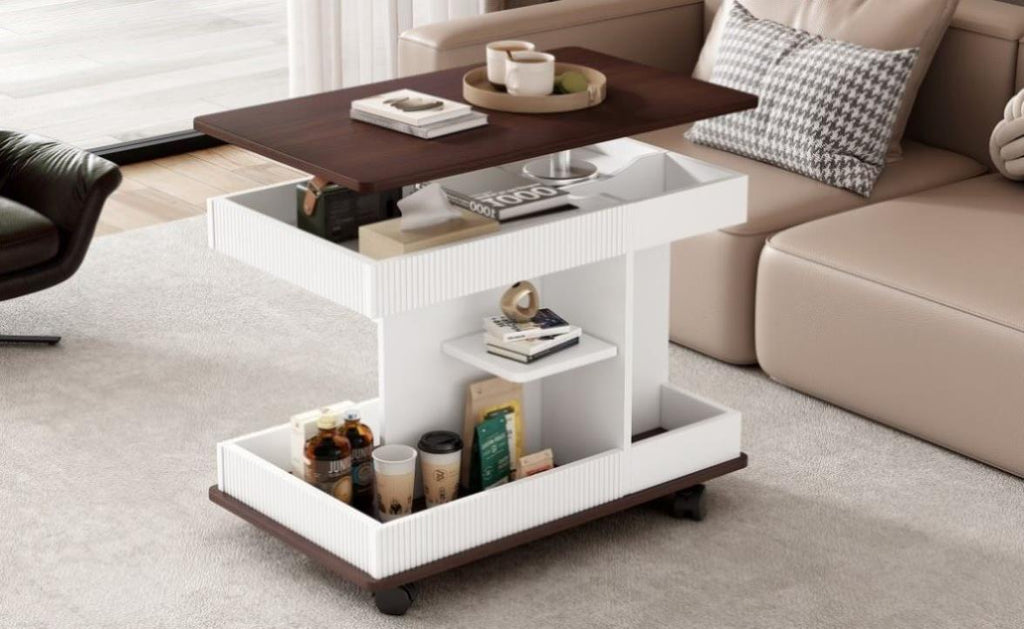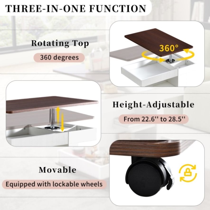 The top of the table can be raised and rotated 360 degrees. Once lifted, the table reaches a height of 28.5 inches, making it perfect for comfortable use while sitting on a sofa.This is especially handy for temporary work or casual dining, allowing you to keep everything within easy reach while maintaining a relaxed posture.