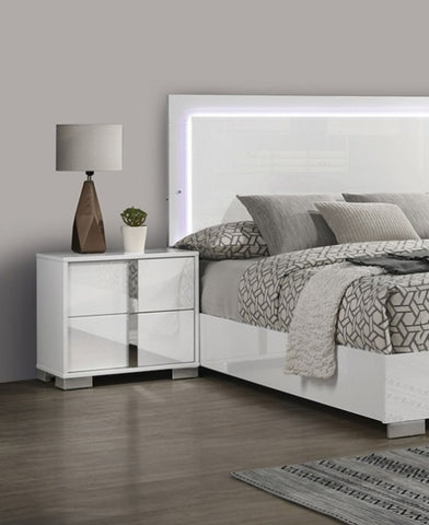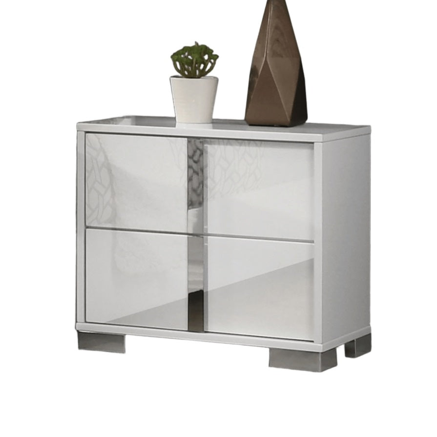 Product Description:- A fitting night stand to a modern home, the bedroom collection features a striking chrome accent design. Beyond their singular function, the vertical chrome handles cut the drawer fronts in half, giving the case goods their progressive appeal.