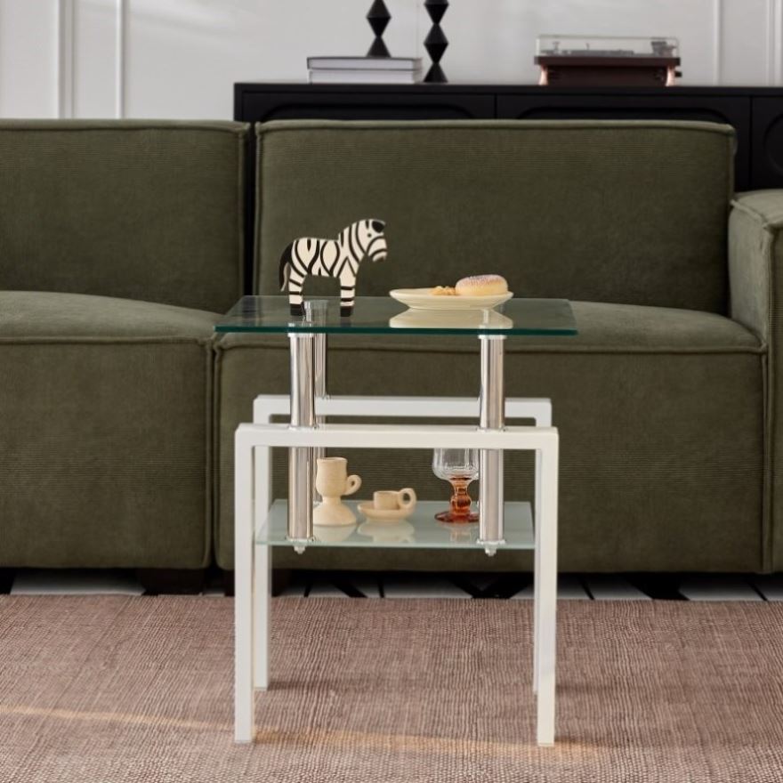 White Tempered Clear Glass End Table, 2-Layers Small Table with Storage, Living Room Side Table W1718P177829