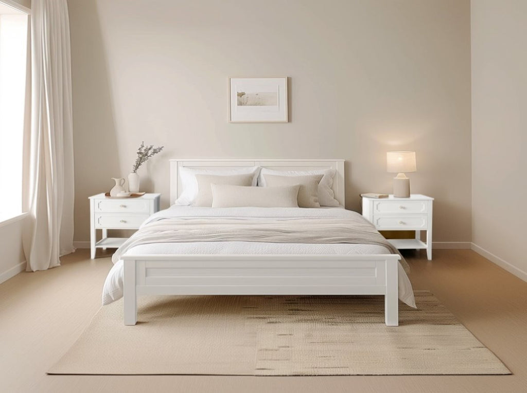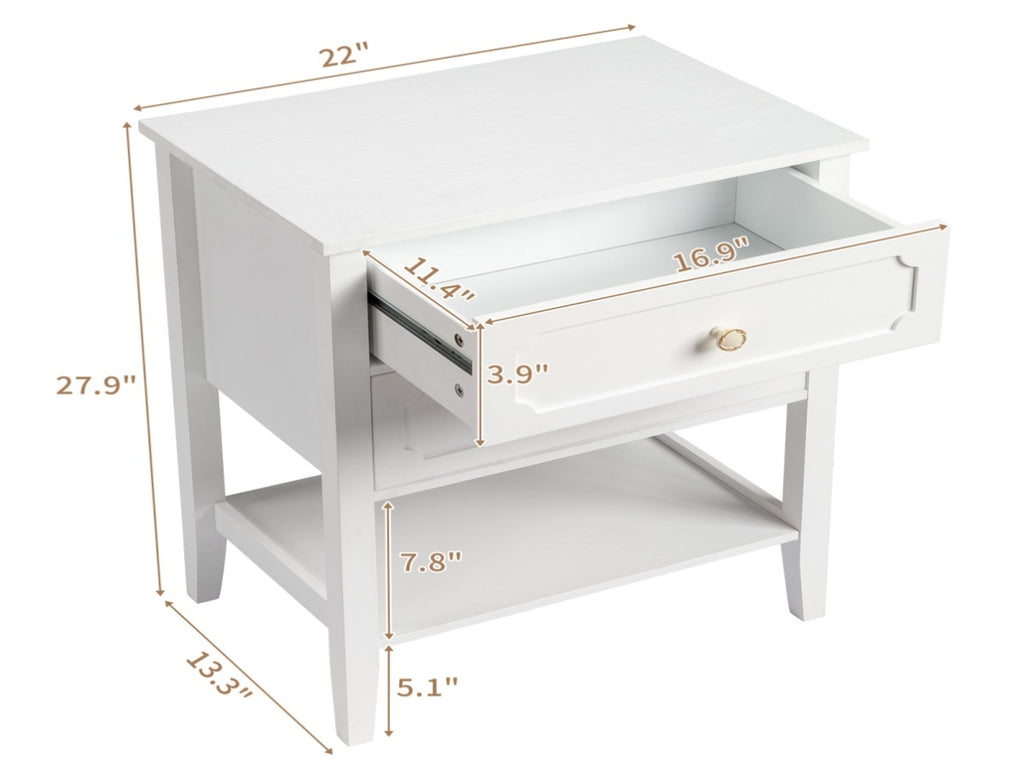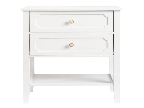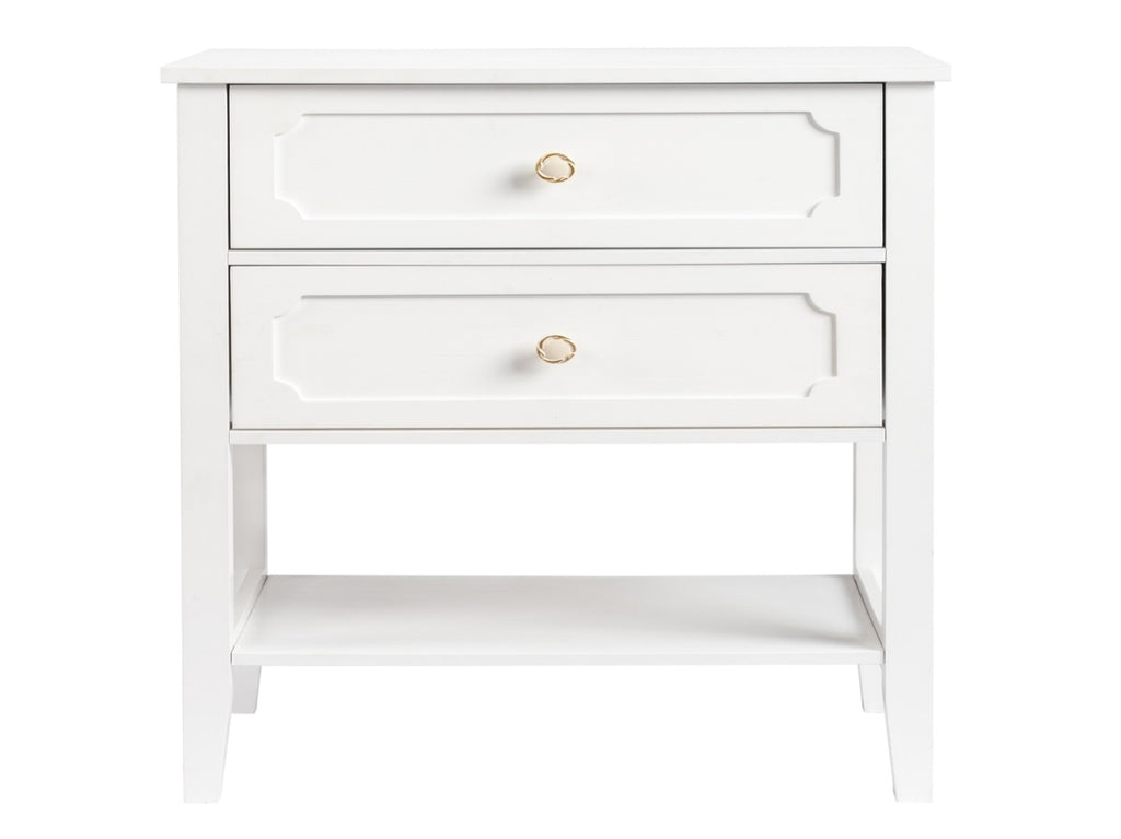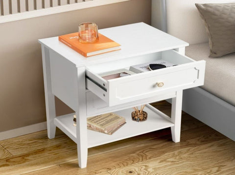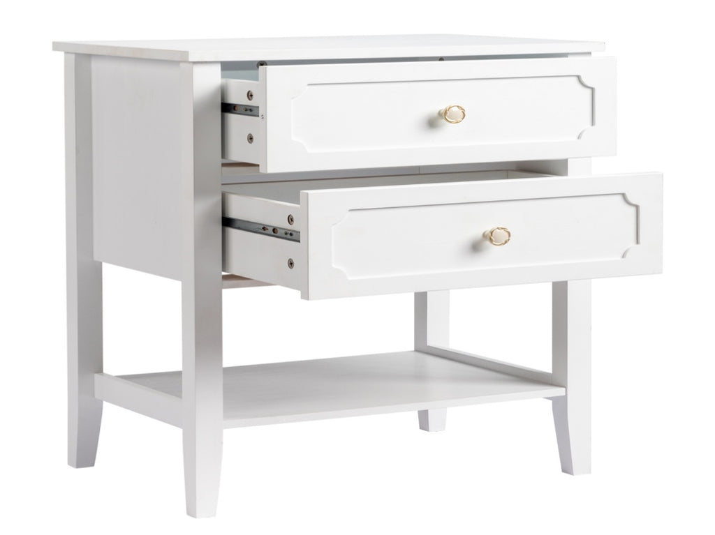 This nightstand come with 2 Drawer and Shelf. Crafted from solid pine wood, its frame features a subtle slatted design.