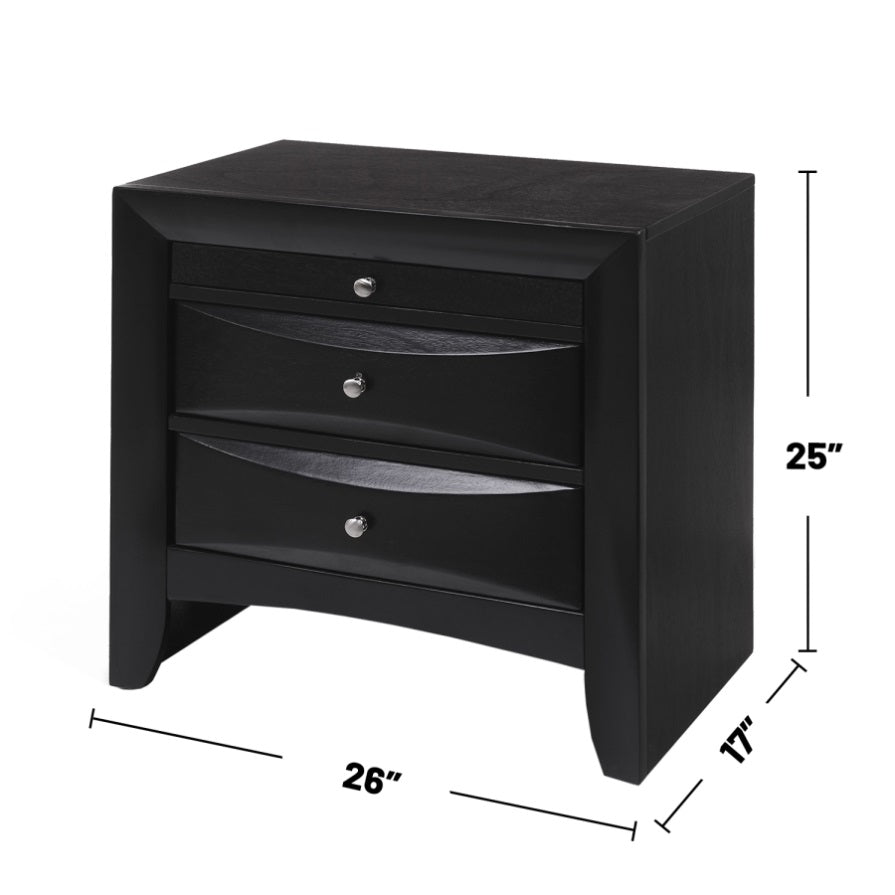This classic-looking nightstand features two spacious storage drawers and one pull-out tray for you to keep things organized. With an English dovetail and center metal glides, the tray will keep essentials close by, and a pull-out tray which offer you additional surface area. A modern black finish with shaped drawer fronts.