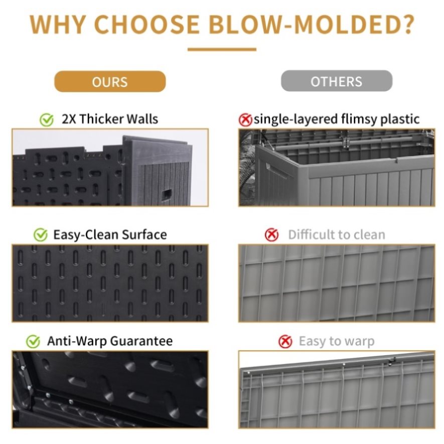 Durable Outdoor Patio Box: This 230-gallon resin deck box is crafted from weather-resistant materials, double-layer cover design and solid structure, including bottom plate and bottom reinforcement ribs. It withstands various weather conditions while maintaining its appearance, making it a perfect addition to any garden, backyard, or patio.