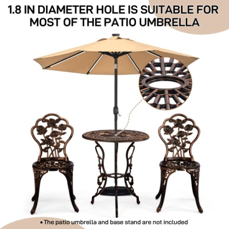 Patio Table with Umbrella Hole: Center 1.8in umbrella hole in the table transforms your outdoor space into a sun-safe retreat, the bistro patio set is perfect for poolside cocktails, garden brunches, or balcony tea parties. Compatible with standard market umbrellas.