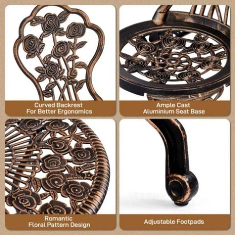 Weather-Resistant: Crafted with premium cast aluminum and reinforced stainless steel screws, this bistro set resists rust, corrosion, and weather damage. Its zero-maintenance design allows effortless cleaning with dry/wet cloths, ideal for year-round outdoor use.