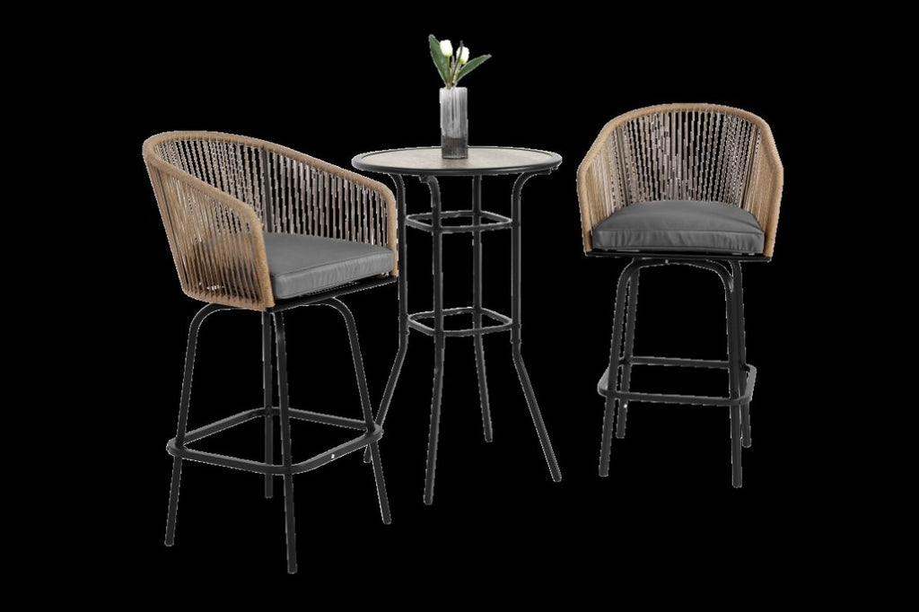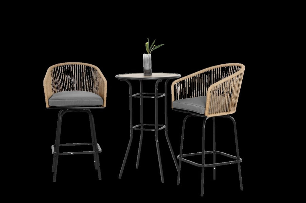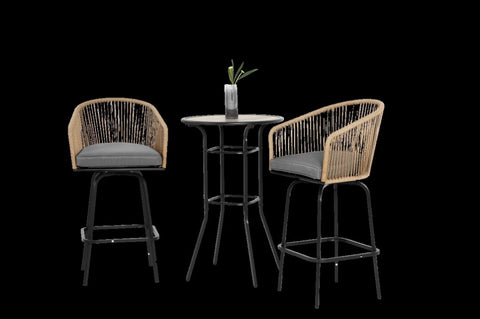 Combines ergonomic high back design with seamless swivel functionality, this bar set provides a stylish and elevated seating option that adds flair to any space. Patio bar table features elegant DPC woodlike table top