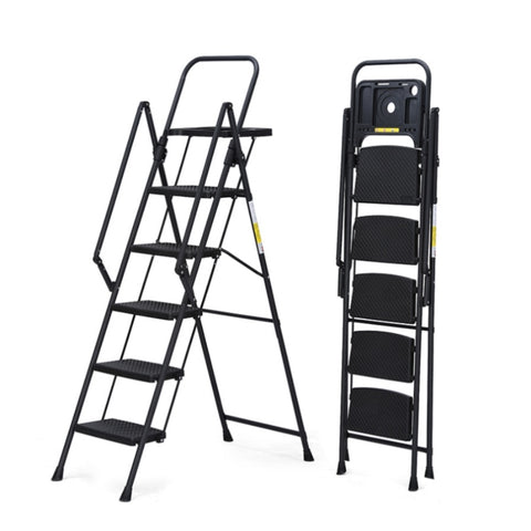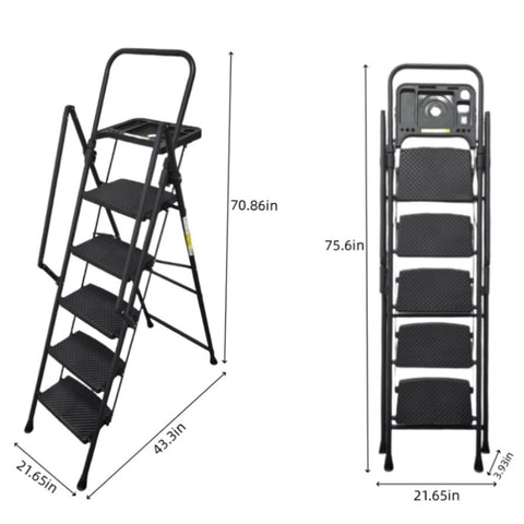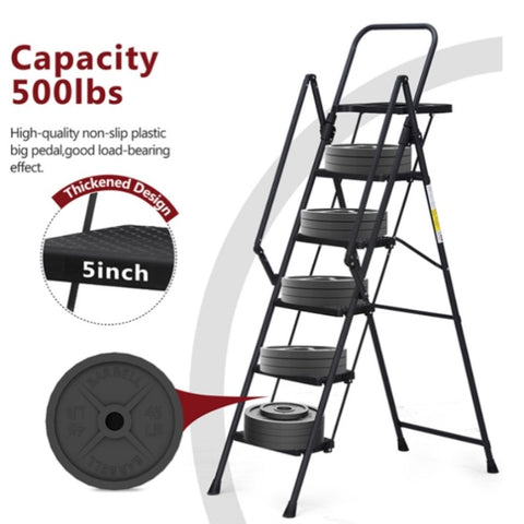 NON-SLIP PROTECTION: The 5 step ladder has non-slip rubber handgrip making the stool easy to climb and carry. Wide pedals with non-slip rubber pattern offer heel-to-toe foot support. The thickened rubber ladder feet fully contact the ground and the comfortable rubber handgrip design enhances the safety and stability of the ladder.