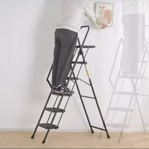 MULTIFUNCTIONAL USE: This folding step stool ladder with handrails is essential for any room, household, kitchen, library, pantry, office. The height is just right for cabinets, closets, and light cleaning. It is easy to carry around for multiple jobs, and is great for cleaning, painting, washing windows and so on. It acts as a chair or something to step on for small pets, a flower stand or a storage rack. Wider pedals provide more storage space.