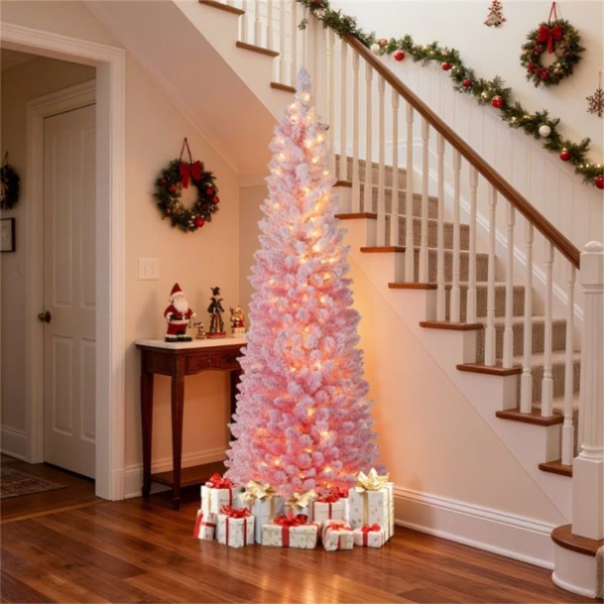 ● Winter Magic in Every Detail: Adorned with 392/527 snow-flocked branch tips, the slender Christmas tree embodies the essence of the holiday season. Transitioning from a soft pink base to a frosty peak, it blends icy elegance with a touch of whimsy to make your space more inviting. ● Adjustable Lighting Modes: Featuring 140/180 warm white LED lights, the artificial Christmas tree illuminates your space with festive cheer. With 8 adjustable lighting modes accessible through a controller, you can effortlessly create the perfect vibe for various events. The UL listed adapter ensures secure usage. ● Superior Security and Stability: Constructed from flame-resistant and allergic-proof PVC material, the seasonal decoration tree prioritizes safety. It is complemented by a sturdy folding metal stand that provides stability and prevents tipping. A pre-installed screw on the stand eliminates the risk of misalignment. ● Hassle-free Assembly: The slim Christmas tree is designed with 2/3 detachable trunks featuring a hinged structure for automatic branch placement. So you can simply fluff the branches to achieve a natural fullness. Additionally, a pair of gloves is included as a bonus for a stress-free assembly experience. ● Space-saving Pencil Shape: Standing at an impressive 6/7 feet, the hinged holiday tree is not only a decorative centerpiece but a practical solution for enhancing various spaces like offices, malls, and cafes. Its slender profile allows it to effortlessly nestle into any corner. Specifications Color:Pink Material:PVC, Metal Tree Height:6 ft Tree Width:1.6 ft Diameter of Stand:18" Number of Branch Tips:392 Number of Sections:2 Number of LED Lights:140 Net Weight:9.5 lbs