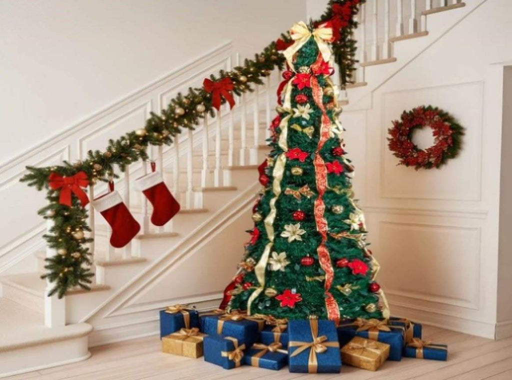1. Fully Decorated: This fully decorated pop-up Christmas tree takes the stress out of holiday decorating. With its lifelike branches adorned with holly leaf accents, twinkling fairy lights, bows and ribbons, shimmering balls, poinsettias, and a striking bow topper, it brings festive magic to your space in seconds—no additional decor needed.