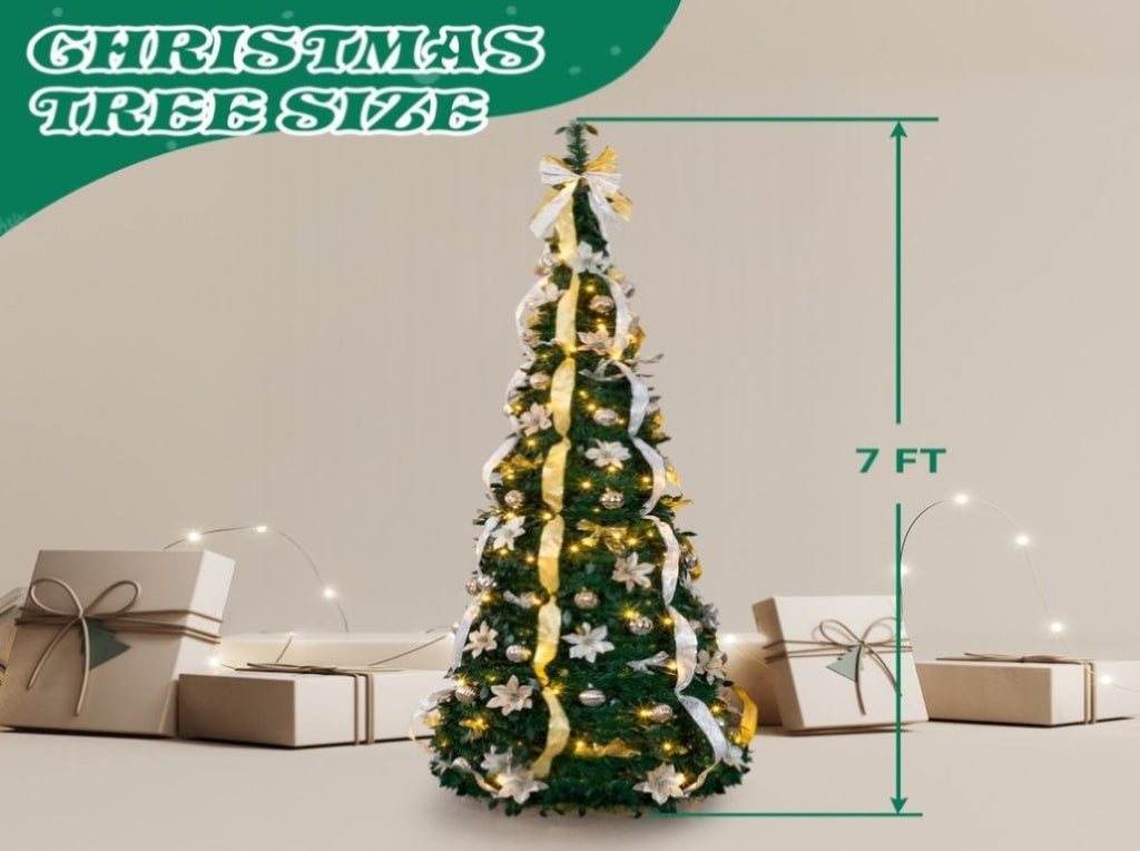 1. Fully Decorated: This fully decorated pop-up Christmas tree takes the stress out of holiday decorating. With its lifelike branches adorned with holly leaf accents, twinkling fairy lights, bows and ribbons, shimmering balls, poinsettias, and a striking bow topper, it brings festive magic to your space in seconds—no additional decor needed.