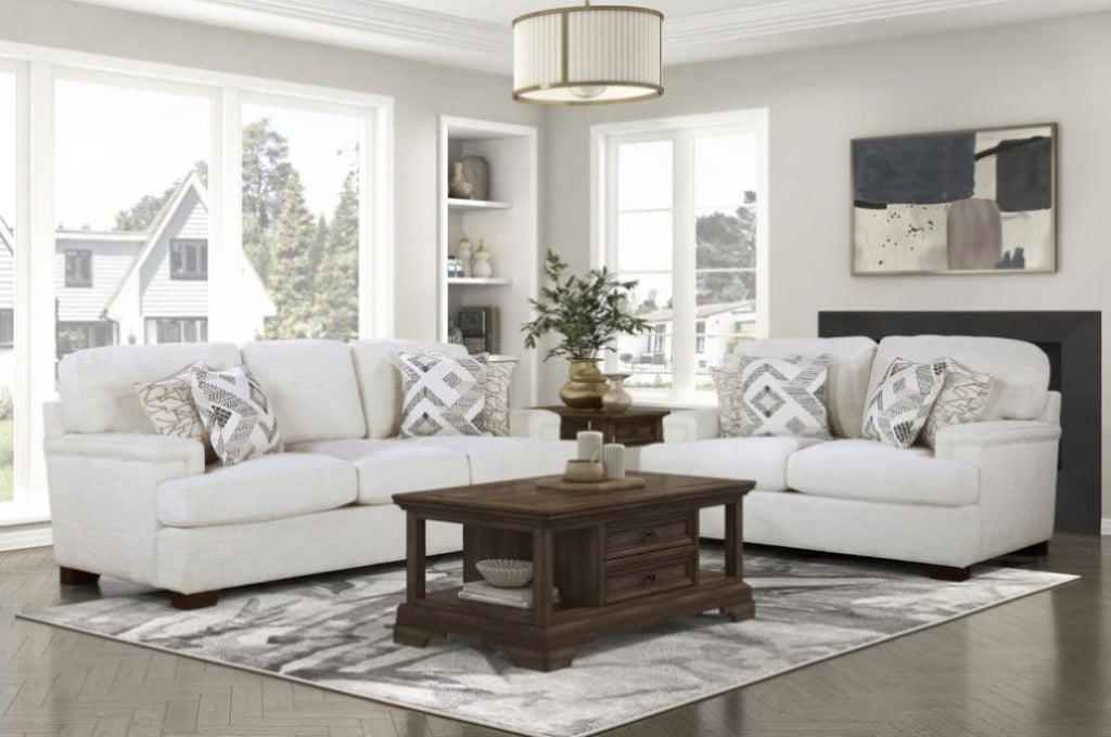 Subtle modern elegance lends its design inspiration to create the lines of the Orson Collection. Substantially sized for your comfort, the distinct profile of the sofa lends ample seating space to your living room. Cream chenille fabric upholstery covers the collection with espresso-hued wood legs providing support. Contrasting decorative toss pillows provide accent to the sofa. PRODUCT DIMENSIONS: Overall Dimension: 91" x 43" x 38"H Seat Width: 73" Seat Depth: 25.5" Seat Height: 21.5" Arm height: 26" Pillow dimension: 18"x18" (4) Doorway width: 27" Listing Includes: One Sofa Only. Loveseat and Chair: Not included. Simple Assembly Require.