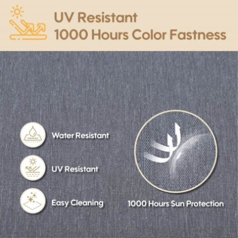 3-year Color Fastness : Waterproof Material: Outdoor cushions for patio furniture are made of 220GSM high density polyester fabric with the help of the fabric our patio furniture cushion could last 3 years color fastness. And we are confident our cushions could withstand at least 1000h intense midday sunlight.