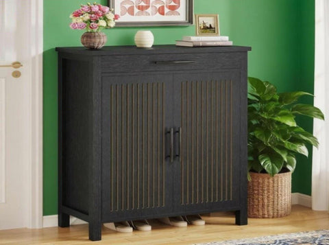 • Louvered Door Design: Harmonizing vintage allure with contemporary style, this entryway shoe cabinet features two louvered doors for satisfactory air circulation and excellent shoe storage. Its stylish black finish adds timeless charm to your home