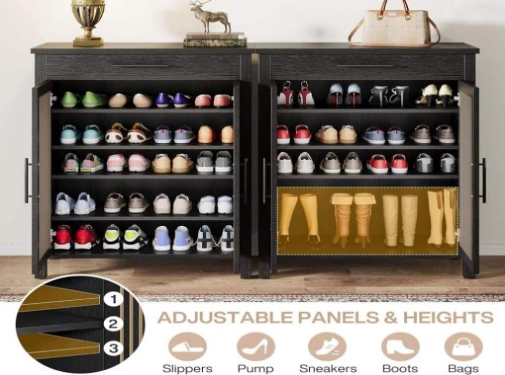 • Sturdy & Safe Construction: Crafted from high-quality MDF, this freestanding shoe cabinet can support heavier items. It features adjustable foot pads and anti-tip devices for increased safety and stability