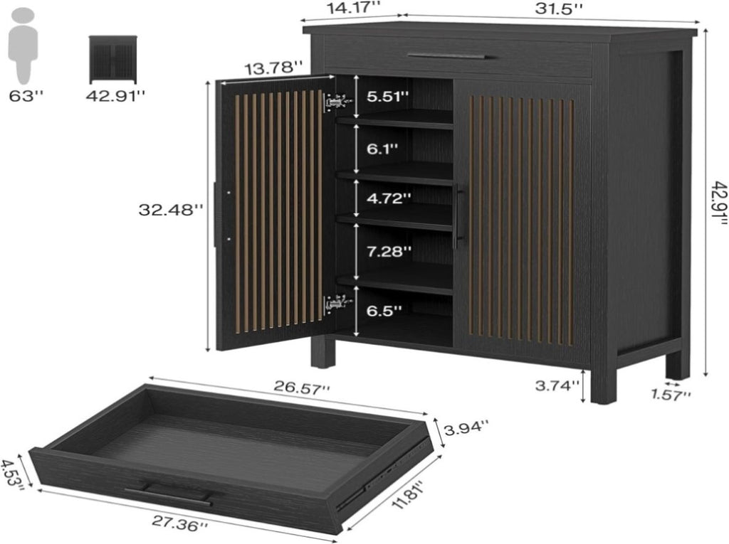 • Large Drawer Space: A spacious drawer in the shoe cabinet with doors ensures easy access to daily essentials like keys, headphones, or sunglasses. Display books, plants or decorative items on the ample tabletop to enrich your décor