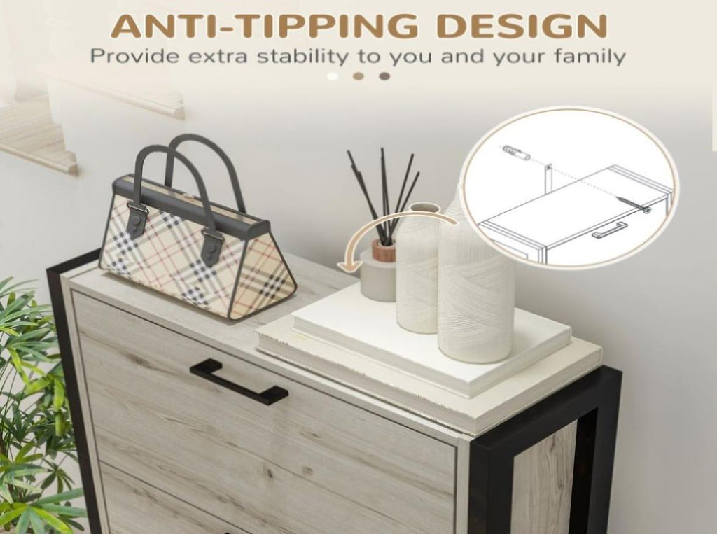 - - It can store up to 15 pairs of shoes with 3 flip-down drawers