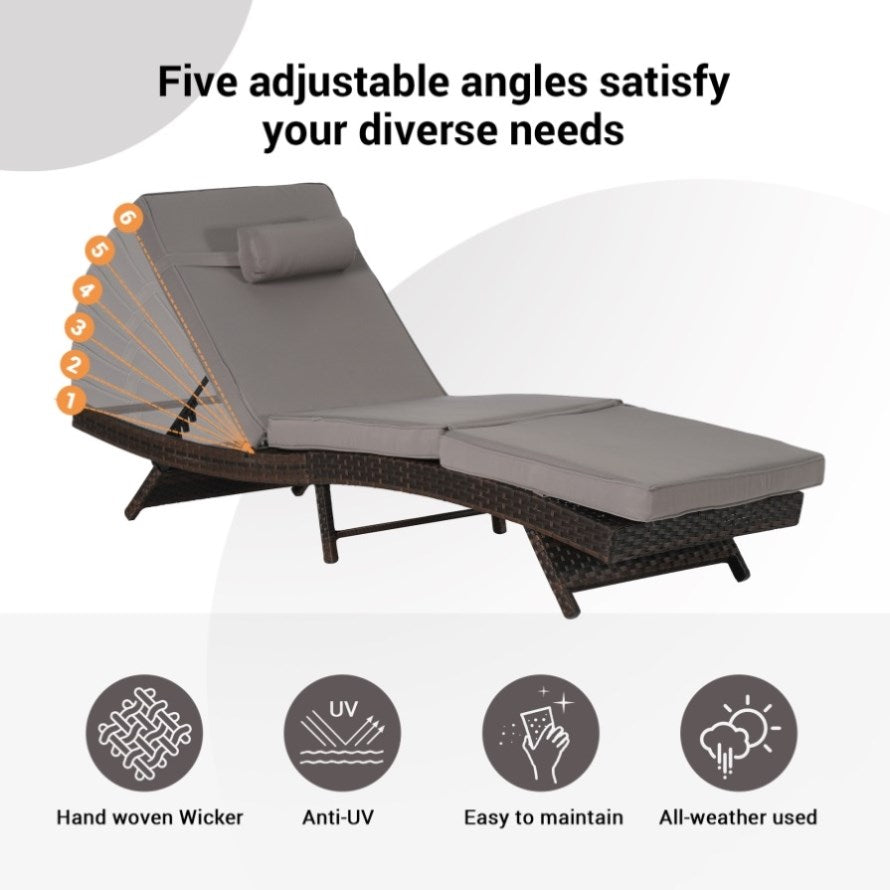 Product Description Product Size: 76.77*24.8*12.6 inch Net weight :61.73 lbs Gross weight : 66.14 lbs Color : Brown Rattan + Dark Gray Cushion Cushion Thickness:3.2 inch Single sofa Load bearing: 600 LBS has 5 adjustable angles for you need Product Features 【Classic & Functional】:This rattan lounger is ideal for sunbathing and relaxing outdoors by yourself, whether it's in your garden, patio, balcony. The 2-piece chaise lounge set of all-weather PE rattan and padded cover set goes well with most outdoor furniture.It's light portable,easily removable and can be perfect outdoor to invite over a friend,tan outside sipping tropical drinks and even more commercial use in the open air. 【Sturdy & Durable】Made of premium PE rattan and rust-resistant steel frame, this outdoor rattan chaise chair is stable and solid which has a long lifespan, while also including a cushion. Metal wrapped in rattan: Powder coated, rust-resistant steel ensures a strong and stable base, with the PE wicker making this reclining rattan garden furniture sturdy, durable, easy to clean and resistant to UV and light water damage. Adjustable backrest: This rattan day bed can be changed to five different positions for an angle which suits you – whether fully relaxing or reading a book. Weather resistant- can be put both indoor and outdoor; Good breathablity, good for our health; Anti-UV- fadeless; Eco-friendly,odorless; Strong-durable; Easy to clean, use wet cloth or wash it directly with a hose