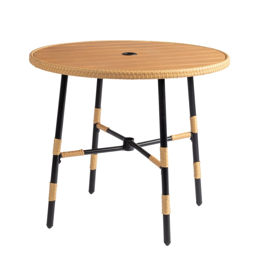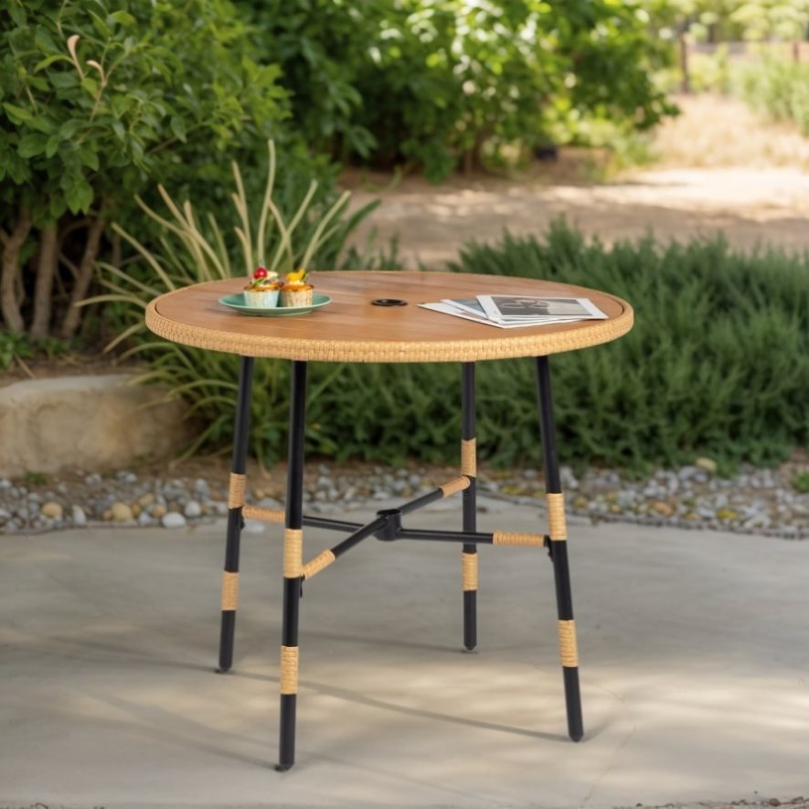 Enjoy outdoor meals and gatherings with this stylish and functional Patio Dining Table with Umbrella Hole. Designed to comfortably seat 4 people, this round dining table features a handwoven rattan edge that brings a natural charm to any garden, patio, or balcony. The slatted tabletop is heat-resistant, quick-drying, and easy to clean—ideal for all-weather use. An umbrella hole in the center allows you to add shade on sunny days, while the cross-frame support and adjustable feet ensure enhanced stability on uneven ground. Whether for morning coffee or evening meals, this outdoor table blends beauty, durability, and convenience.
