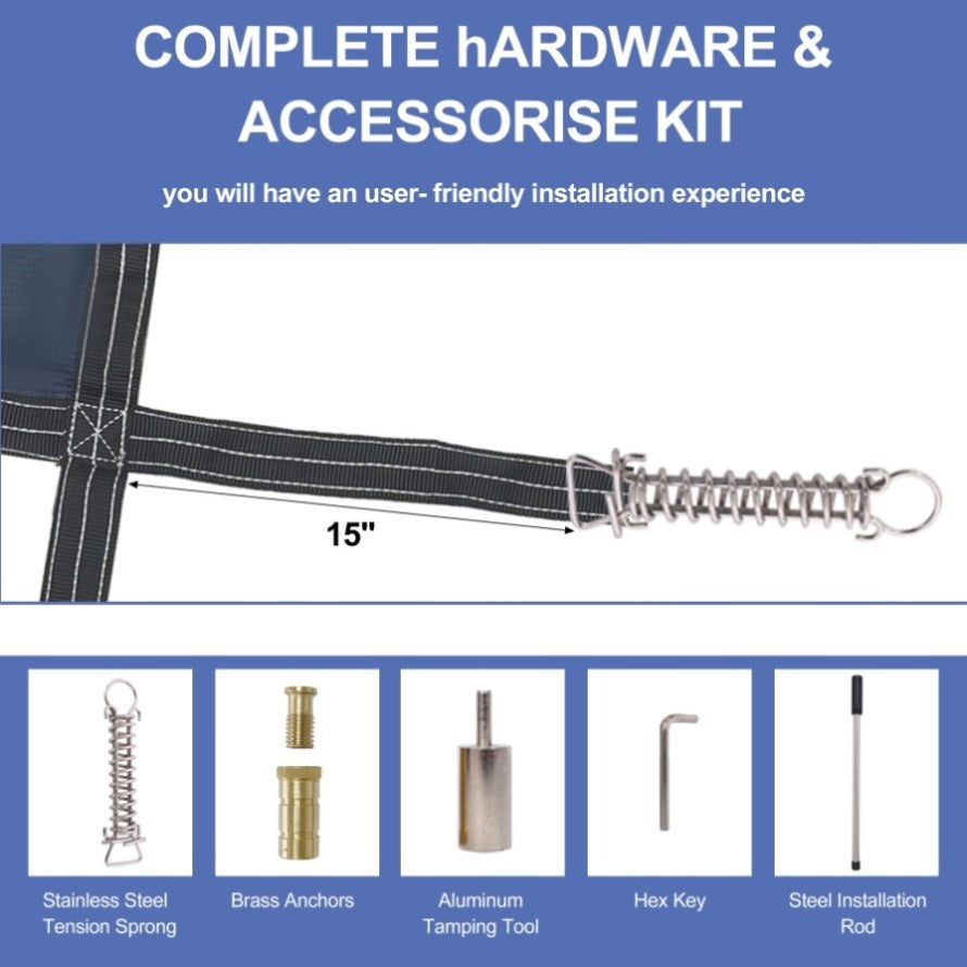 Complete Hardware Kit for Easy Installation: The pool cover comes with all the necessary hardware for a simple and quick installation. The package includes brass anchors, stainless steel springs, and all required installation tools. With a drill and tamp brass anchoring system designed for concrete and an adjustable rope length, setup is straightforward and adaptable to different pool configurations.