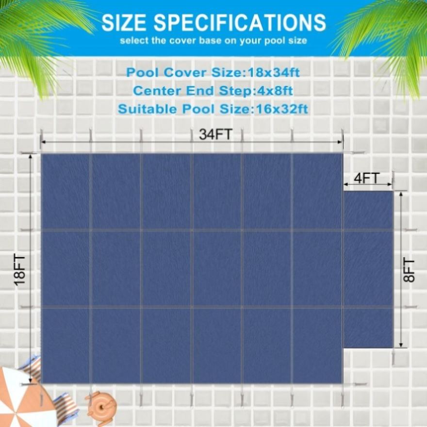 Hassle-Free Winter Pool Care: Our 16 x 32 ft Inground Pool Safety Cover is designed to simplify winter maintenance. With an additional 4x8 ft Center Step, this cover fits pools up to 16 x 32 ft, ensuring a snug fit without stretching. Be sure to measure your pool before purchasing for the perfect fit. Ideal for home, garden, and hotel pools, this cover provides excellent protection all season long.