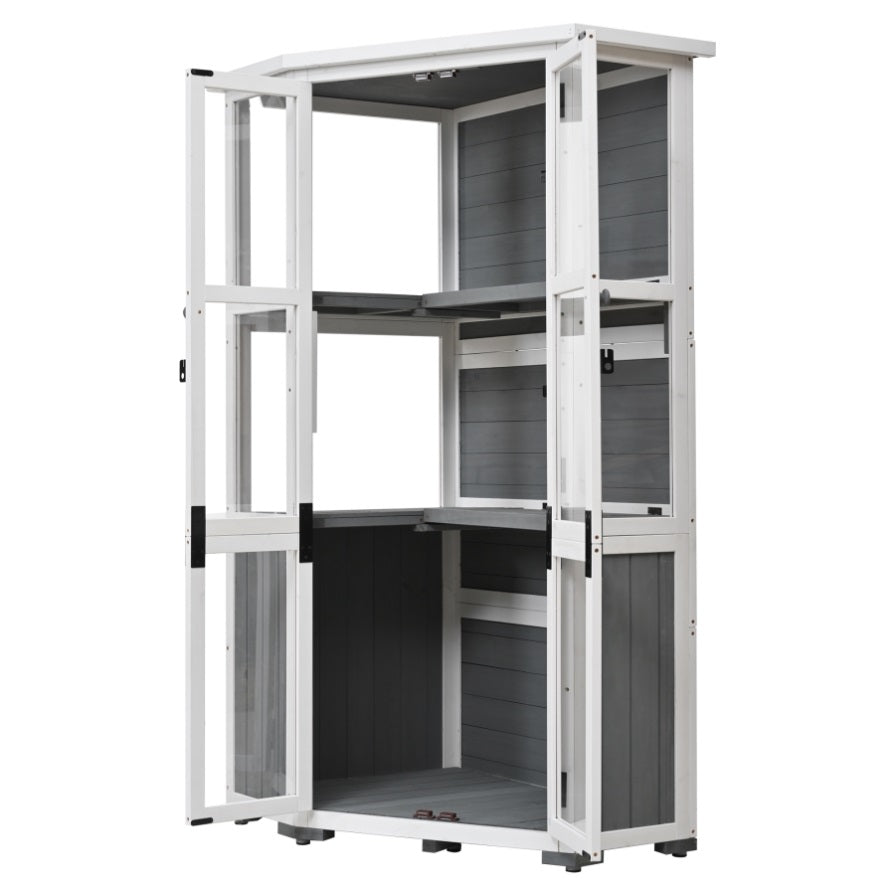 | Highlights | Garden Shed or Mini Greenhouse // Fir Wood Frame // Transparent Polycarbonate Panels Round and 2 Doors (Good for Both Plants and Tools)// Asphalt Waterproof Roof // Lockable 2 Doors // Adjustable Foot Pads // 4 Shelves ( 2 of them Foldable) // 2 Anti-tipping Devices // 3 Colors Available // Assembly // 33lbs Weight Capacity for Each Shelf // Can be Used for Flowers/Garden Tools // Pentagon Cabinet(Different with usual one) |