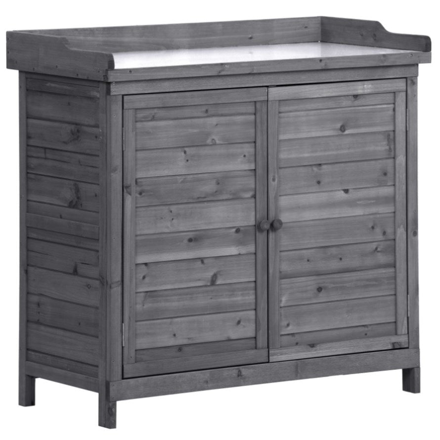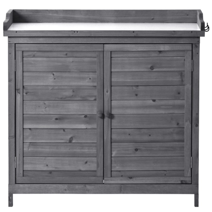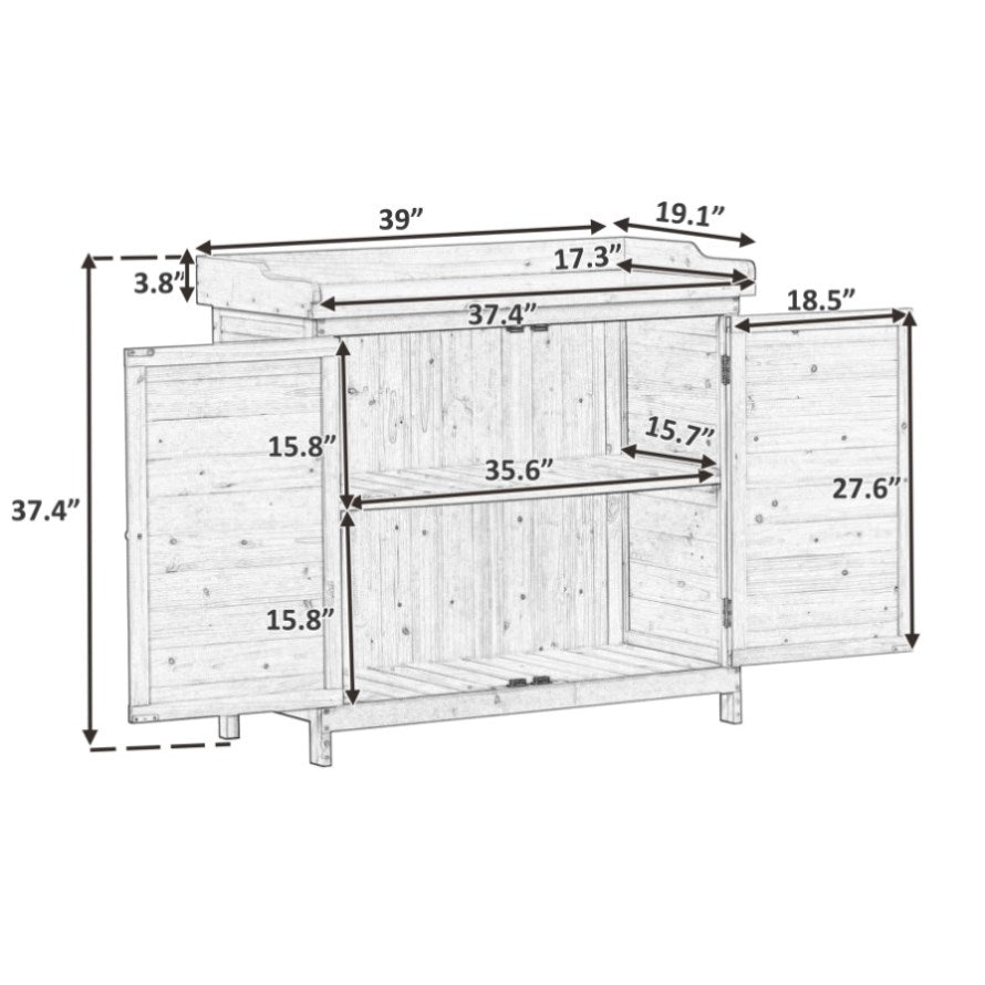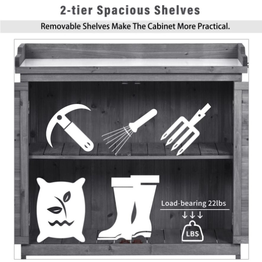 [Ample 2-Tier Storage Cabinet] If you are a big fan of gardening, this potting bench will be a great choice. With 37.4" total height, 2 ample storage shelves are designed to keep your tools handy and in one place without bending over or squatting. Constructed with a removable shelf, this potting table is ample enough for not only small tools but also extra soil, pots and other gardening supplies.