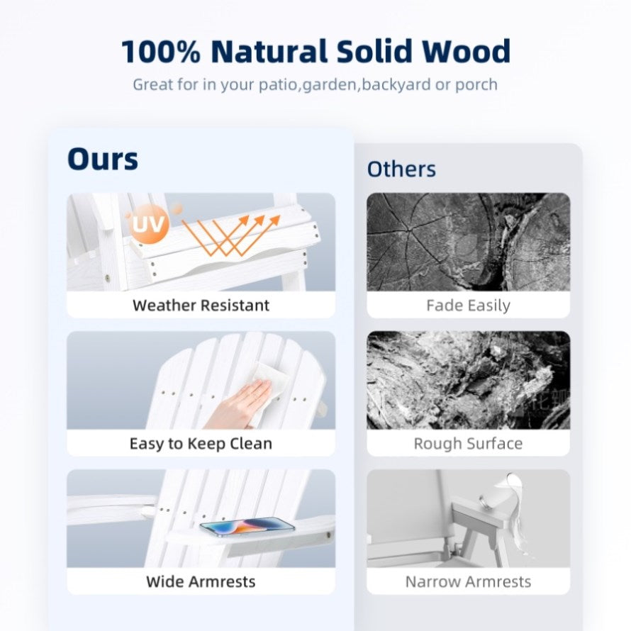 - PREMIUM HEMLOCK WOOD:Outdoor folding adirondack chair is using selected solid wood, every piece was well selected and with brushed finishing, giving you premium and royal feel when sitting on it