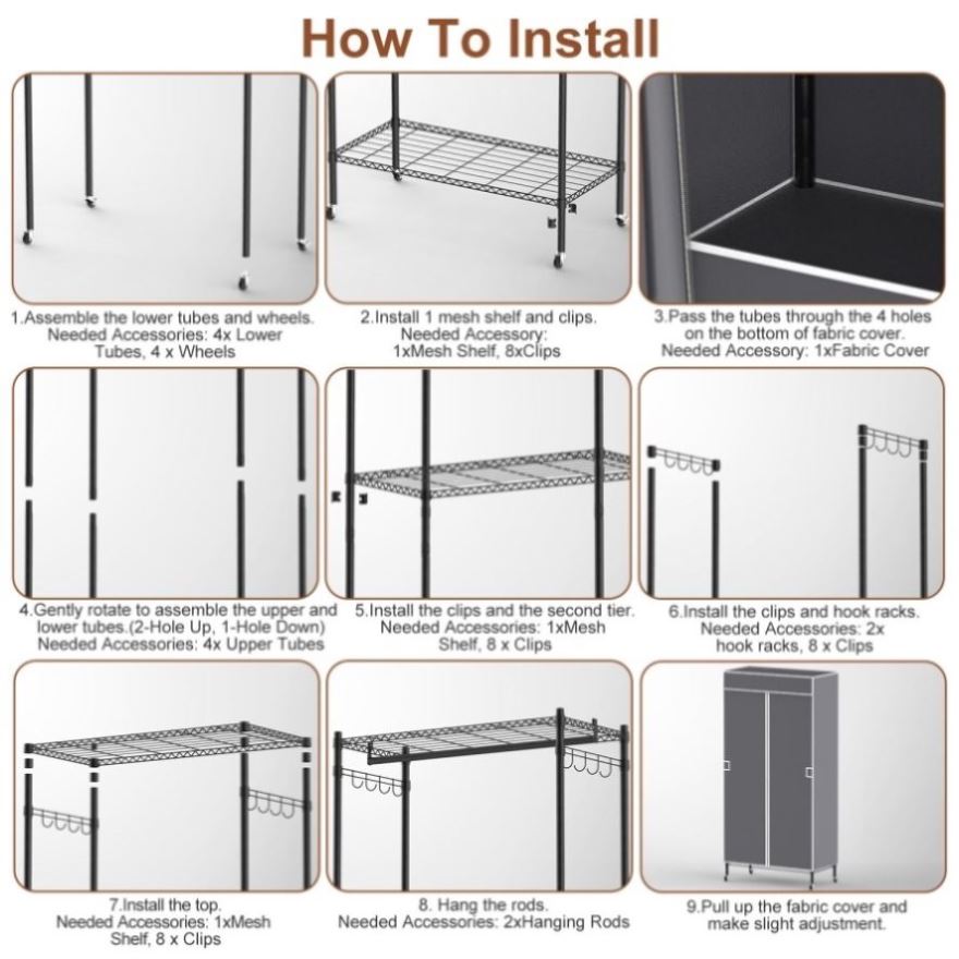 Multiple Ways of Installation: Our garment rack can be installed in 4 ways: rack with wheels and cover, rack with feet and cover, rack with wheels but no cover, rack with feet but no cover etc.. All tools included, easy to install.