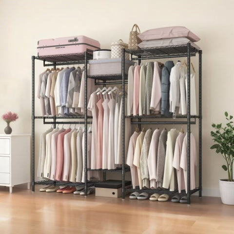 DIY Free Assembly Method: This heavy duty garment rack breaks through the fixed form of traditional clothes hangers and supports diversified DIY assembly. Each shelf and each clothes hanging rod can be freely adjusted in height to adapt to rooms of various sizes. You can also remove the two shelves in the middle and instantly have two independent portable clothes hangers. Whether it is bedroom storage, balcony drying, or temporary changing scenes, you can switch on demand to meet multiple usage