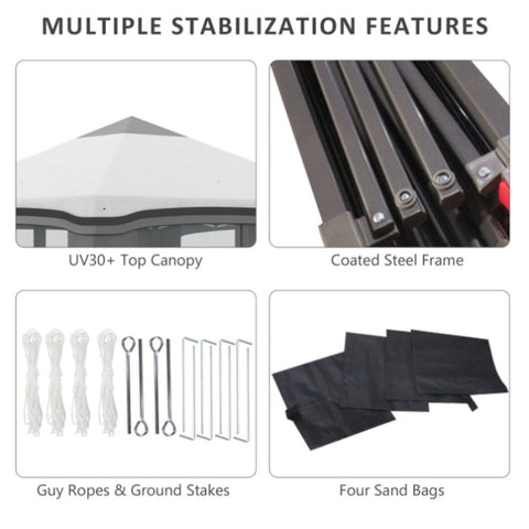 - - Comes with weight bags, guy ropes, and stakes for mounting it to soft ground