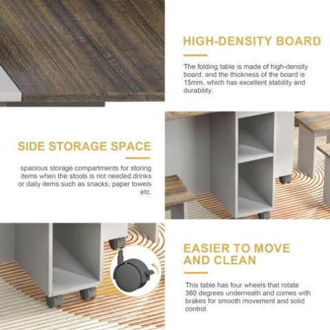 Space-saving folding table with storage space: The table can be folded into a small cabinet, and there are storage layers and drawers to store kitchenware, drinks or daily items such as snacks, paper towels, etc.