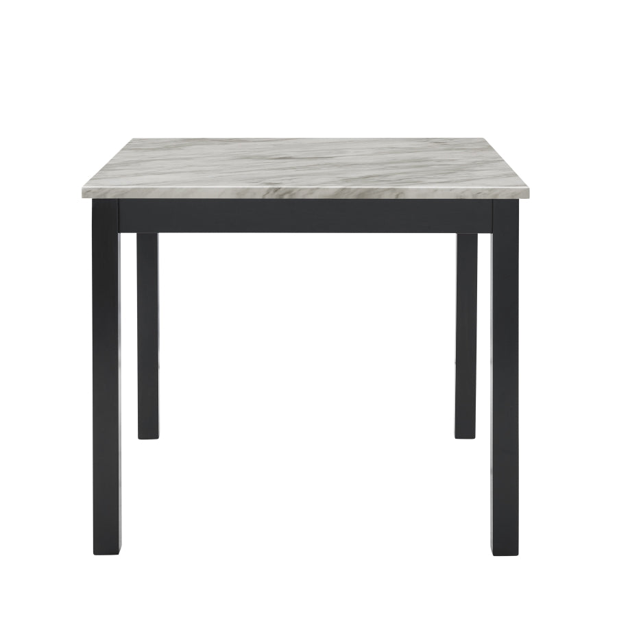 This 42" Square Counter Set adds a touch of glamour to your home. The Faux Marble top is a beautiful white and gray pattern that is set off by the black solid wood table frame. The Top is heat and water-resistant, super easy to care for, and a statement-making design. The table is surrounded by 4 upholstered velvet leather chairs, made of solid wood and with side, front and back stretchers for strength and durability.