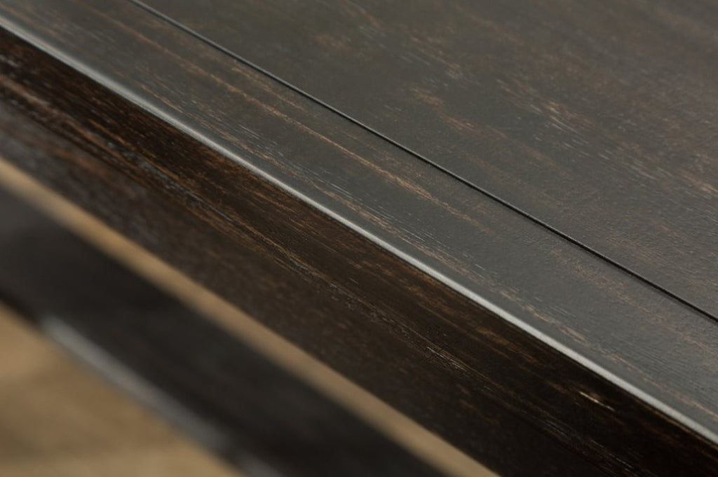 The table is made with select veneer and solids in a dry vintage weathered finish. Chic and contemporary style, sleek rectangular shape with footrest.