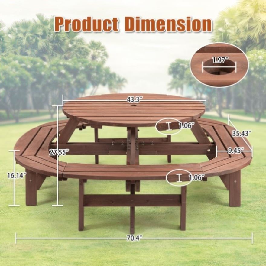 Rustic CharmWith its natural wood grain design, this wooden picnic table with umbrella hole adds a rustic touch to outdoor setting. Ideal for patios, gardens, poolside areas, or backyards, place it on the patio, in your garden, or underneath your favorite tree.