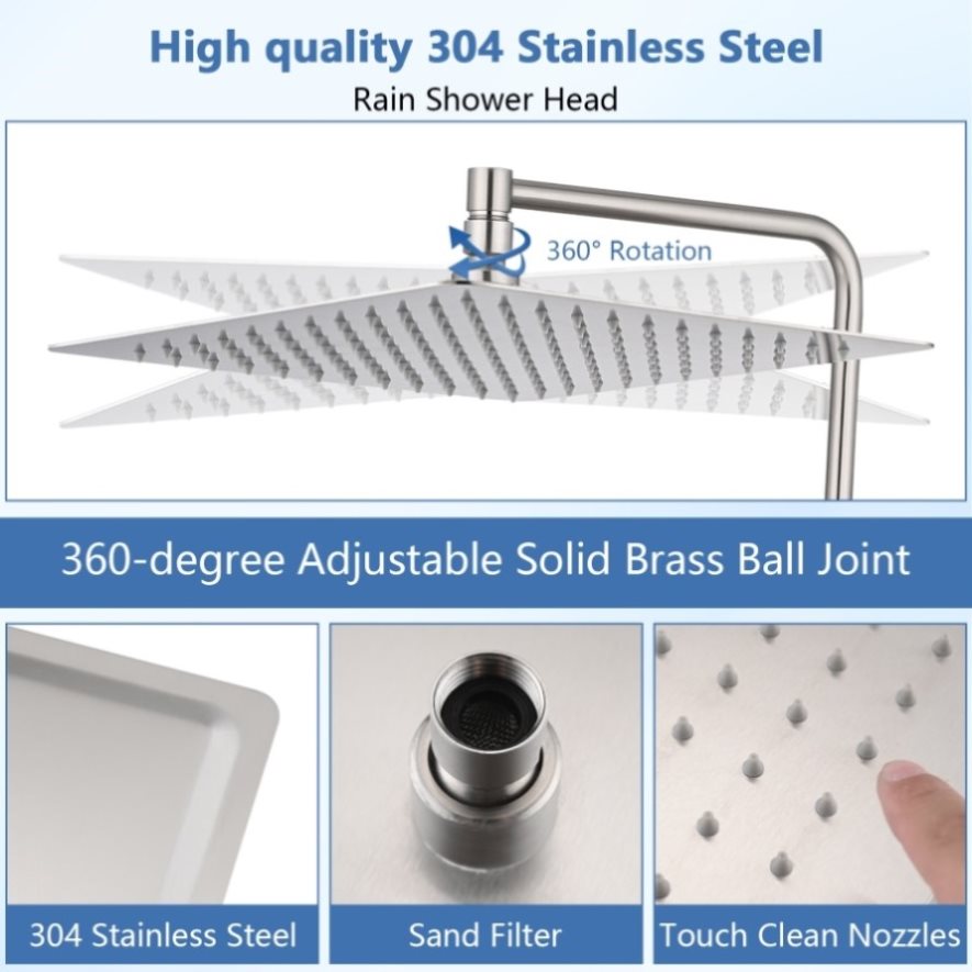 The 12" shower head has 144 closely connected silicone nozzles to give you a hotel-style shower experience and is self-cleaning without clogging.Ultra-thin design with the air-in technology, provid you perfect shower even in low-pressure areas.