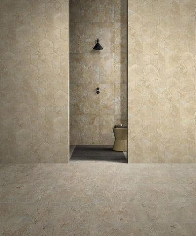 The wall in the middle is made of 12X24 " Gold Yellow Beige polished marble tiles W1696104351, another two sides wall are made of Hexagon Gold Yellow Beige FS finished marble tiles W1696P262336. The floor is made of 12X24 " Gold Yellow Beige honed finished marble tiles W1696P262329.