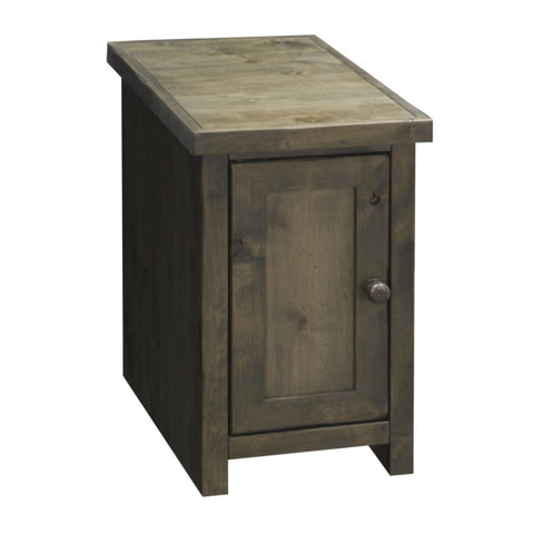 This 14 inch chairside table boasts a striking and modern take on rustic charm. Skillfully crafted from Knotty Alder Solids and Veneers, this side table is finished in a rich Barnwood with classic hammered Bronze hardware. This versatile table will accent your favorite chair or bedside beautifully while providing ample space to showcase a table lamp up top and concealed storage behind one door below. Fully assembled upon arrival, this table is ready to unbox and enjoy. Bring home this high-quality chairside table for a picturesque upgrade in your living room.
