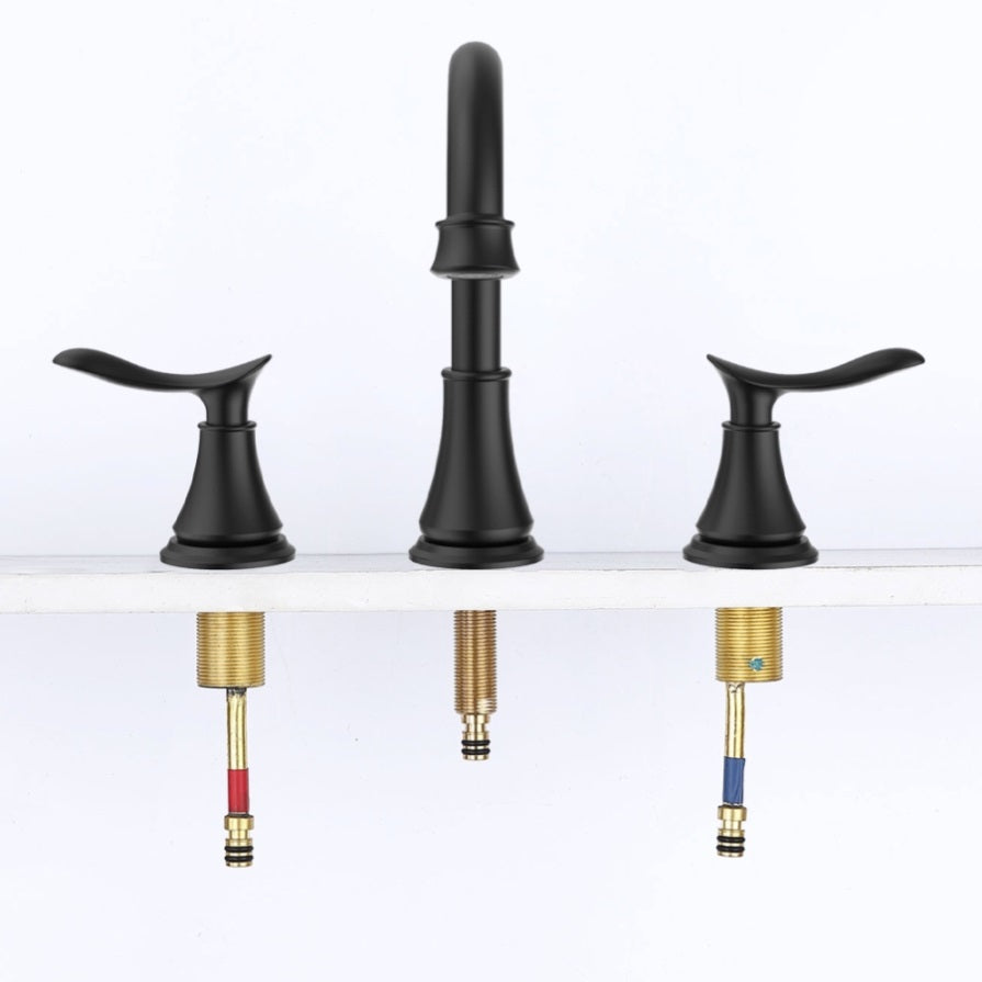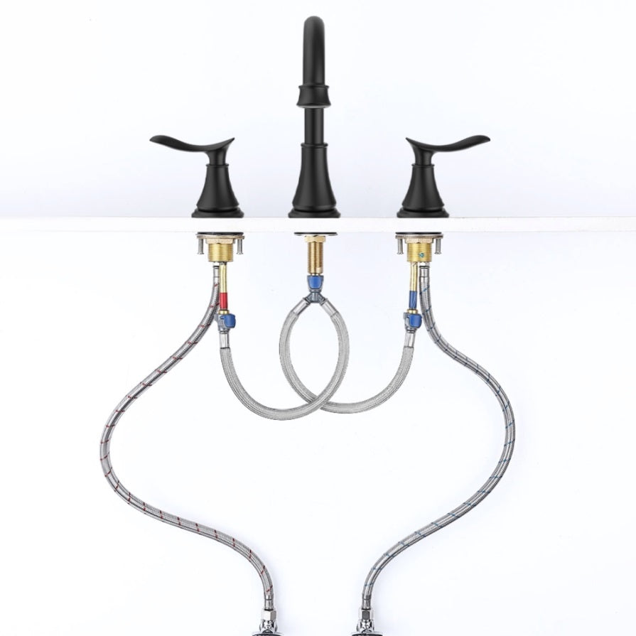 TWO-HANDLE LEVERS - 2 Handle metal lever design for precise control in both volume and water temperature. The high-quality ceramic & copper cartridge has passed 500,000 cycles of water tightness test to ensure that the bathroom faucet 3 hole Matte Black is stable and will not leak water. Upgraded overflow pop up drain with built-In stopper.