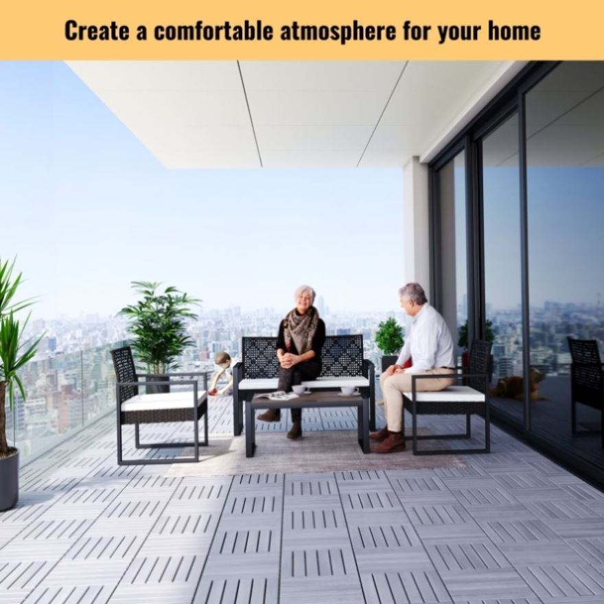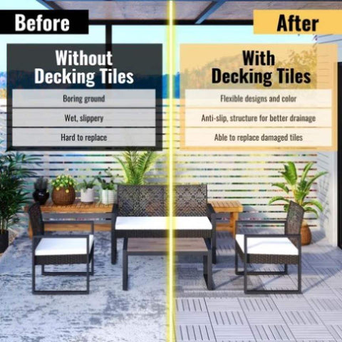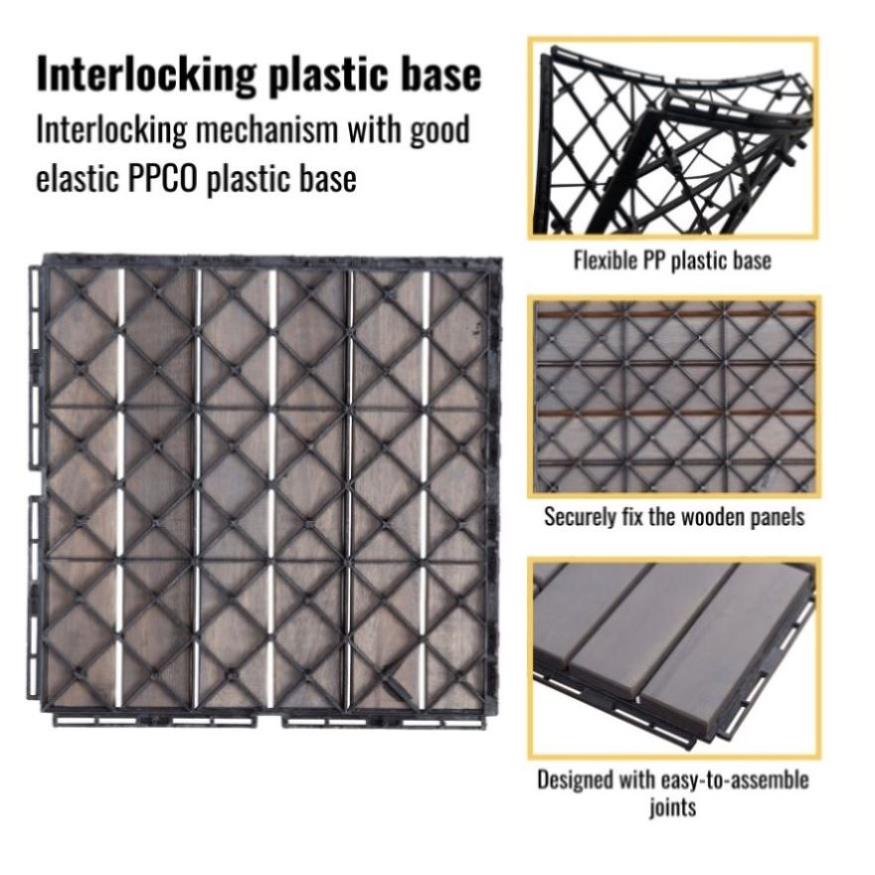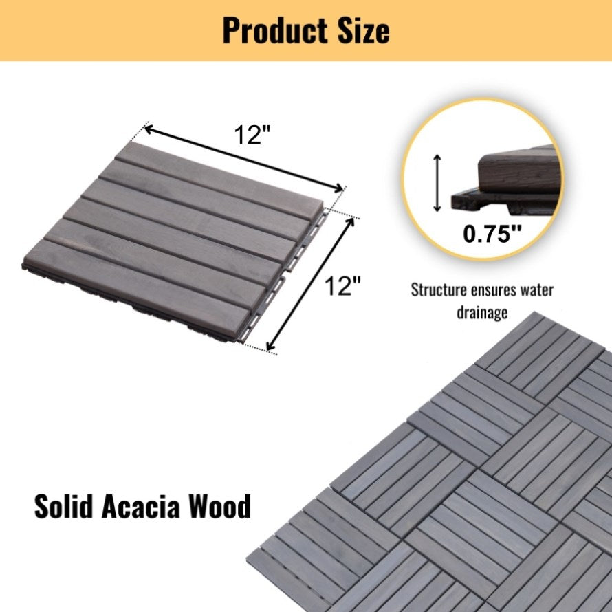 Perfect Size: Each tile has a square shape of 12 inches x 12 inches with 0.75 inches thickness. The wood part is 0.47 inches thick and the plastic part is 0.28 inches thick enough for drainage during the rainy season.