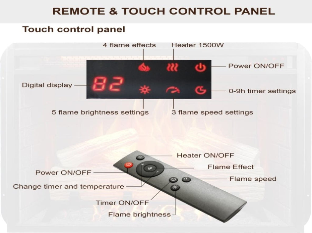 It employs advanced technology to mimic the appearance of a genuine fireplace, creating a warm and cozy ambiance.The flame effects can be used with or without heat ,4 flame colors and 5 adjustable flame brightness can be set freely.
